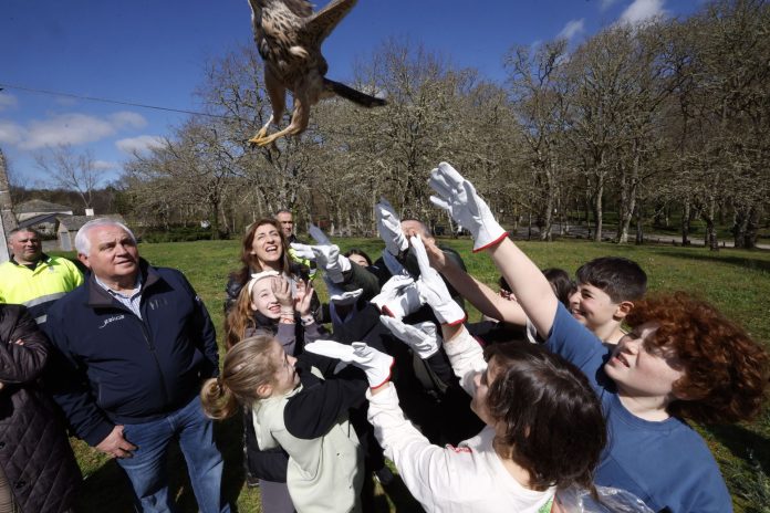 Acompañada por un grupo de casi 30 alumnos de 5ª de primaria del CEIP Laverde Ruiz, la responsable autonómica ha explicado que las dos aves liberadas este jueves en el área recreativo de Santa Isabel, a un lado del río Miño, son un juvenil de azor macho, recogido en el mes de octubre en un colegio de Castroverde con el ala derecha herida, y una hembra adulta de la misma especie que había aparecido la finales de febrero en el entorno urbano de Lugo con signos de deshidratación.