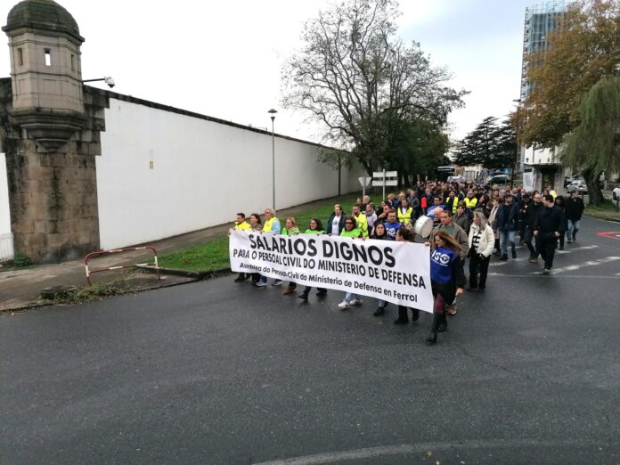 El personal civil del Ministerio de Defensa se manifestó en la mañana de este jueves en Ferrol para reclamar la equiparación salarial con el personal militar y la consolidación de un complemento de 300 euros mensuales en sus nóminas. La protesta, que se enmarca dentro de una ola de movilizaciones a nivel estatal, partió de la puerta del Parque del Arsenal y se dirigió al edificio de Hacienda en Esteiro.
