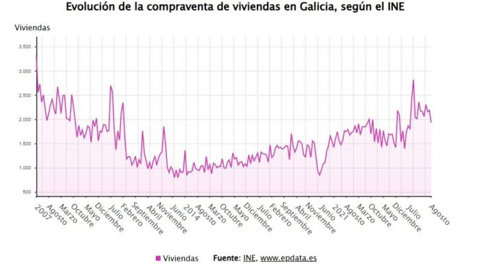 En el mes de septiembre se registró en Galicia la transmisión de 4.367 viviendas, de las que 2.428 fueron en régimen de compraventa, lo que supone un 22,6 % más que el mes anterior y un 0,45 % más que en el mismo mes del año pasado, según los datos publicados por este martes por el Instituto Nacional de Estadística (INE).