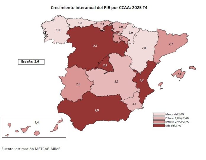 Por su parte, las economías de Comunidad Valenciana, Andalucía, Castilla y León, Castilla-La Mancha y Murcia crecieron por encima de la media estatal en términos intertrimestrales durante el cuarto trimestre del año 2025.