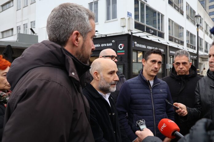 El diputado del BNG en el Congreso, Néstor Rego, junto al teniente de alcalde y portavoz del BNG en Lugo, Rubén Arroxo, se ha reunido este lunes con taxistas lucenses para exigir al Gobierno estatal un «remedio» ante la subida «desorbitada y desproporcionada» del seguro de los taxis.