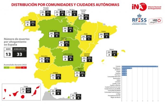 Canarias, con siete personas ahogadas, es la comunidad autónoma que más fallecimientos registró en marzo, lo que sumado a las seis del mes de enero y a las cuatro de febrero, hacen que en este territorio se hayan producido 17 de los 33 ahogamientos mortales que se han datado en España en lo que va de año, es decir, más de la mitad del total.