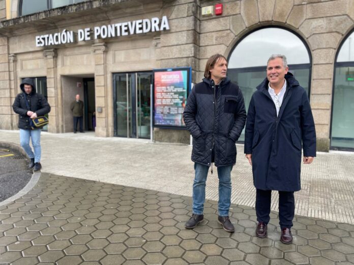 Los concejales del PP Rafa Domínguez y Juan Manuel Muñoz comparecieron este jueves en la estación de ferrocarril de Pontevedra para explicar el contenido de esta moción, que los populares defenderán en el próximo pleno municipal de marzo.
