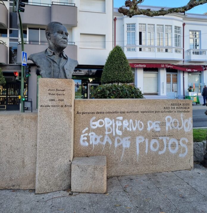 El gobierno municipal del Ayuntamiento de Arzúa (BNG, A.A. y PSOE) han mostrado su rechazo absoluto y su «profunda preocupación» por el acto vandálico cometido contra la escultura de Juan Vidal, alcalde de la localidad fusilado por la dictadura de Franco en 1936.