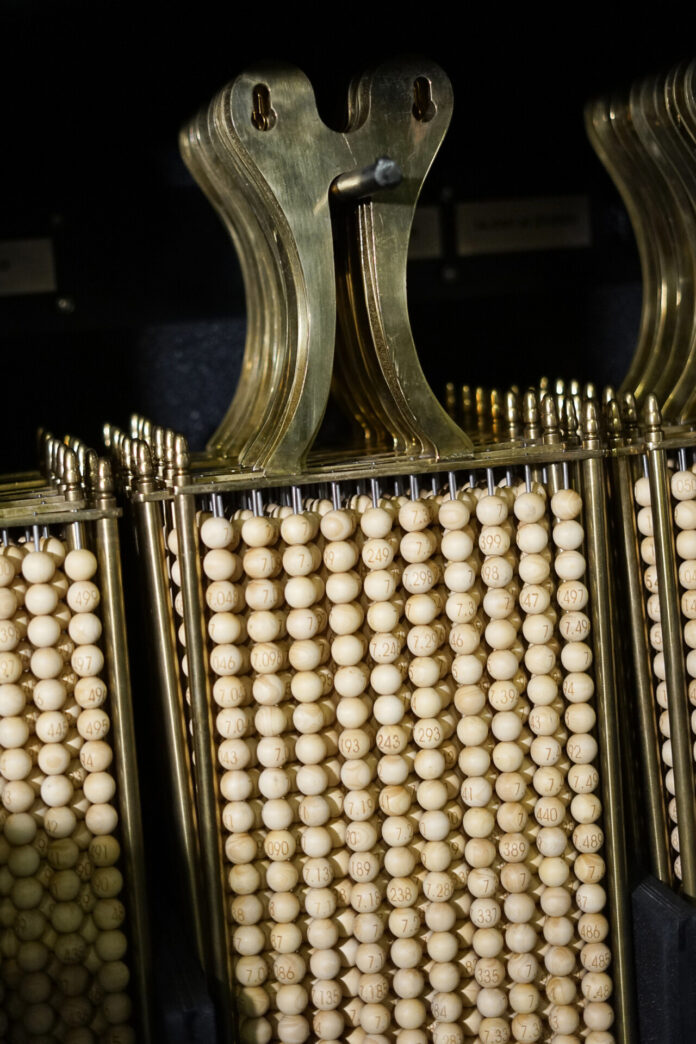 El bombo grande ya está listo para acoger las 100.000 bolas de los números que participan en el Sorteo. Fabricado en el año 2006, está realizado en una aleación de latón y bronce, y tiene una altura de 2,64 metros, una anchura de 2,11 metros y un peso aproximado de 850 kilogramos. El diámetro de su esfera alcanza 1,58 metros.
