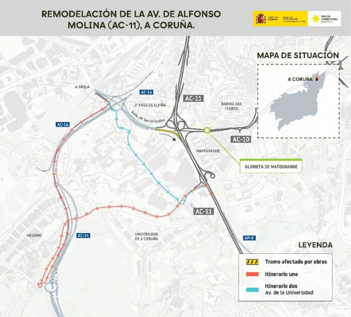 El avance de las obras de reforma de la Avenida Alfonso Molina de A Coruña obligará a cortar, desde este martes a las 10.00 horas, el ramal de enlace entre la AC-10 y la AC-11 para llevar a cabo trabajos de reposición de tubería de fundición.