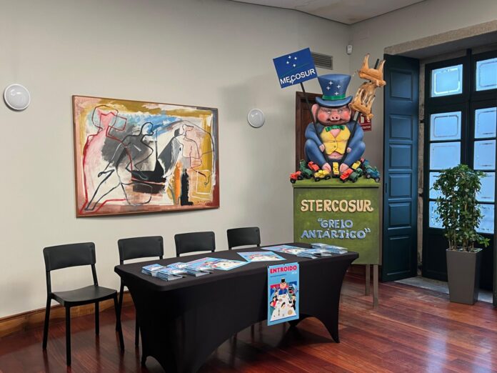 El meco, representado por un cerdo –como es habitual–, está vestido de etiqueta con los colores de Mercosur y porta un cartel en el que se lee ‘Me(r)cosur’, que juega con ambas palabras. «Está sentado en Galicia y aplastándola», ha descrito la concejala de Fiestas.