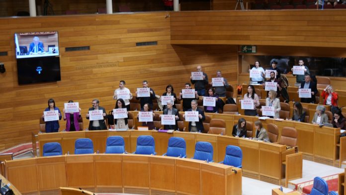 El BNG y el PSdeG han reivindicado este martes en el pleno de la Cámara gallega el ‘No a la guerra’, mientras que el Partido Popular les ha pedido que reclamen al Gobierno central, apuntando que «más de 20 aviones de guerra han salido desde España para atacar a Irán».