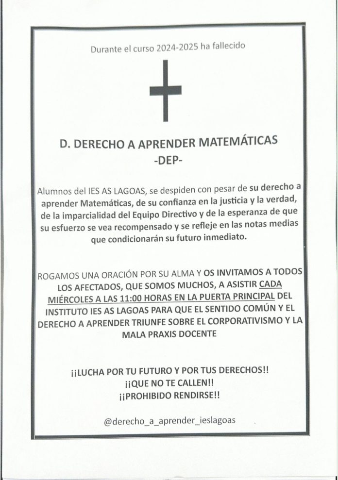 En esta línea, el 24 de febrero de ese mismo año, el conjunto de padres llevaron una pegada de carteles y esquelas en los alrededores del centro que manifestaban, entre otras cosas, ‘Durante el curso 2024/2025 ha fallecido D. Derecho a Aprender Matemáticas -DEP-‘.
