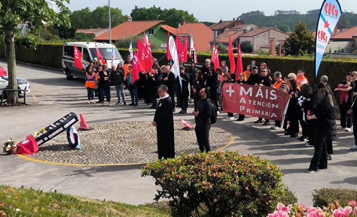 Esta misma mañana CIG-Saúde ha convocado una concentración frente a la sede de la consellería, simulando un entierro, para ilustrar la «muerte» de la atención primaria. Varias decenas de personas han participado en la concentración, con un ataúd y un cura que han representado el entierro del servicio.