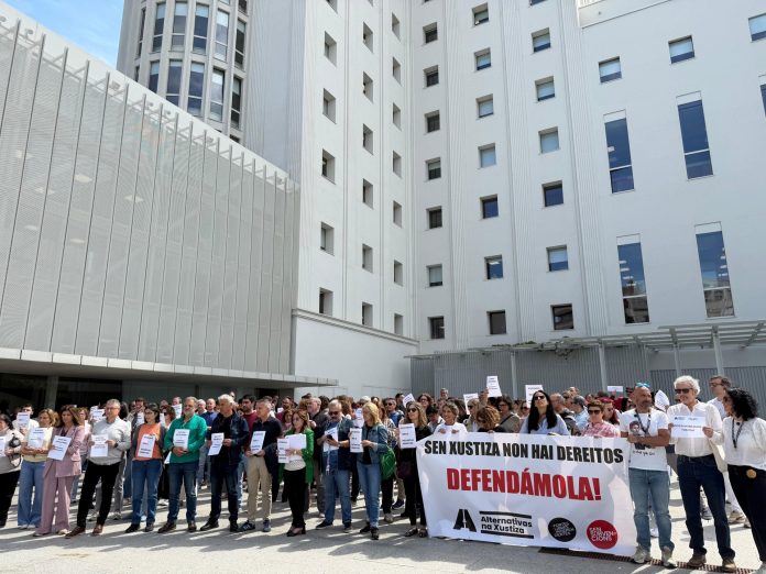 Convocados por Alternativas na Xustiza, profesionales del sector se han concentrado ante la Ciudad de la Justicia de la ciudad olívica tras una pancarta que rezaba ‘Sin justicia no hay derechos. Defendámosla’, reivindicando la necesidad de más medios personales y materiales.